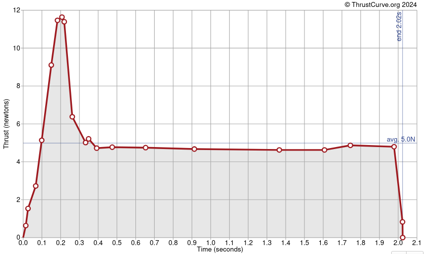 Now, while these numbers are useful, we would only be able to simulate a constant average thrust with them. However the thrust put out by rocket engines tends to vary over time, especially solid propellent ones like ours. To simulate that, we will need the thrust curve of the engine. If we were building our own rocket, we would need to preform static fire tests to figure out this curve. Thankfully we are using standard hobby engines, so I was able to find the curve here.